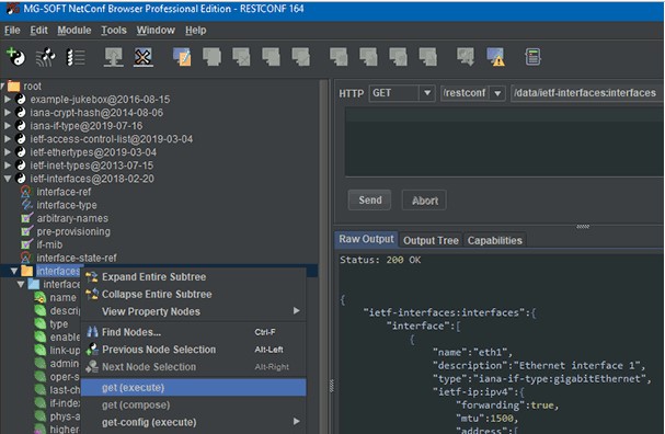 MG-SOFT NetConf Browser fully supports also the RESTCONF protocol with both, XML and JSON encoding of data (RFC 8040). NetConf Browser lets you use all standard RESTCONF HTTP methods like GET (screen shot) , POST, PUT, PATCH, DELETE etc., invoke proprietary operations and actions, and allows receiving server-sent notifications via RESTCONF protocol. The software incorporates YANG-based auto-complete mechanism for composing the RESTCONF URIs, as well as fully fledged auto-completion feature when writing RESTCONF message payloads in XML and JSON format. NetConf Browser supports regular, client-initiated RESTCONF sessions, as well as RESTCONF Call Home sessions. The software supports also RESTCONF extensions for NMDA, as specified in (RFC 8527).